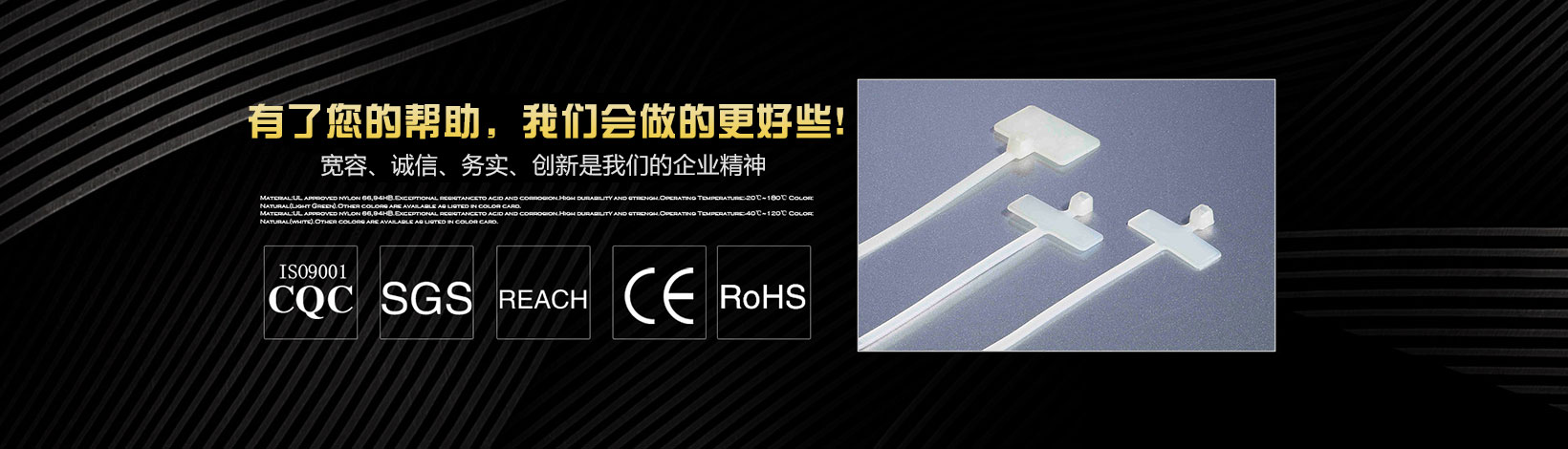 本公司專業(yè)生產(chǎn)銷售尼龍扎帶、特殊型扎帶、吸盤(自粘式定位片)、塑料膨脹管、尼龍壓線帽、電纜防水接頭、鋼釘線卡、R型線夾、飛機型線夾、瓷磚定位十字架、固定座、纏繞管、異型管、齒型管、號碼管、熱縮管、黃臘管、扎絲、鋼管蓋等系列產(chǎn)品。 我們擁有先進的檢測設(shè)備和雄厚的技術(shù)力量,并不斷優(yōu)化生產(chǎn)流程,規(guī)范生產(chǎn)環(huán)節(jié),加強完善質(zhì)量控制系統(tǒng),以優(yōu)異的品質(zhì)深得海內(nèi)外客戶的一致好評。
